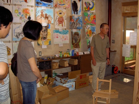 松下さんに教わりながら、エコハウスの土間で釘とかなづちをふるう参加者の皆さん。
